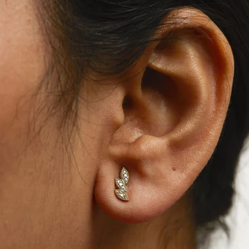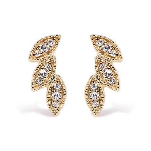 These 10kt Yellow Gold Stud Earrings feature a mesmerizing triple leaf design, symbolizing growth, prosperity, and the beauty of nature. With 18 natural round diamonds, totaling 0.072cttw, these earrings radiate elegance and sophistication. Dimensions 9 x 4 x 11mm