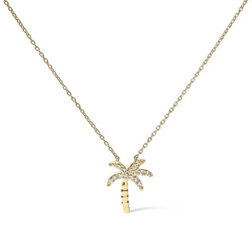 An 18" Inch Palm Tree Pendant Cable Necklace, dimensions 12 x 10 x 2mm. Crafted with utmost precision in 10kt Yellow Gold, this stunning necklace is adorned with 16 exquisite round diamonds, totaling 0.104 cttw.