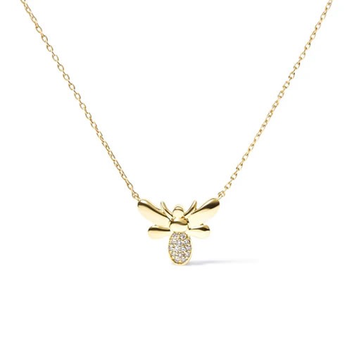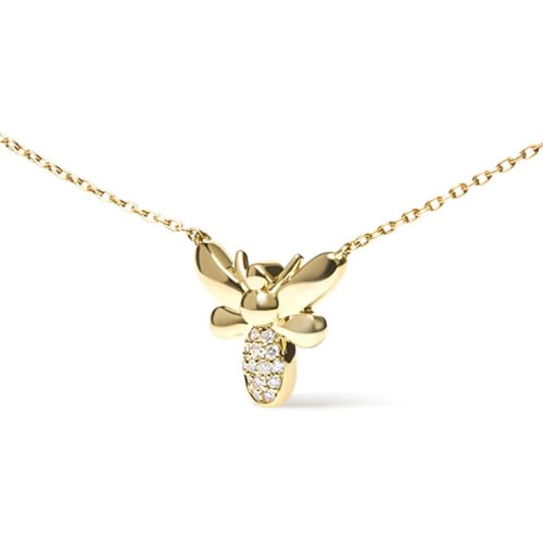 Crafted with meticulous attention to detail, this pendant showcases 14 round diamonds accented in a pave setting at 0.06cttw. This exquisite 10kt Yellow Gold Bumble Bee Pendant Necklace, dimensions 11 x 12 x 2mm, is a must-have for any woman who appreciates elegance and grace. Suspended from an 18" cable chain, this necklace boasts a spring ring clasp, providing secure and comfortable wear.
